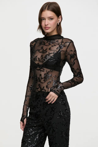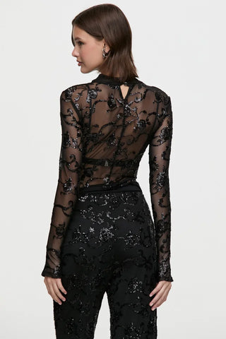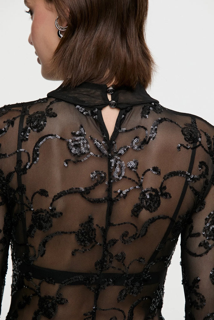 Body confeccionado en un textil exclusivo Tucci Night, con diseño propio de bordado sobre base de punto. De manga larga y semi polera, se destaca por su transparencia y una silueta que estiliza. Ideal para fusionar con sastrería o denim y crear looks llenos de actitud. #MuyTucci #TucciNight