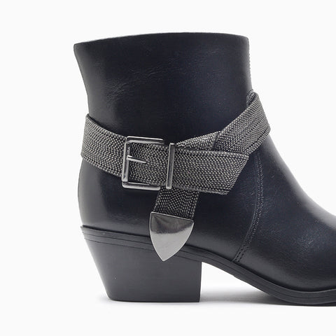 La bota Hush Puppies Helene es un modelo sofisticado y moderno, ideal para realzar cualquier look. Confeccionada en cuero negro, destaca por su diseño elegante con una correa textil ajustable con hebilla metálica alrededor del tobillo, aportando un detalle distintivo y un estilo único. Su punta levemente afilada estiliza la silueta, mientras que su taco bajo y ancho brinda estabilidad y confort para el uso diario. Perfecta para quienes buscan una combinación de moda y comodidad en un calzado versátil y atemporal.