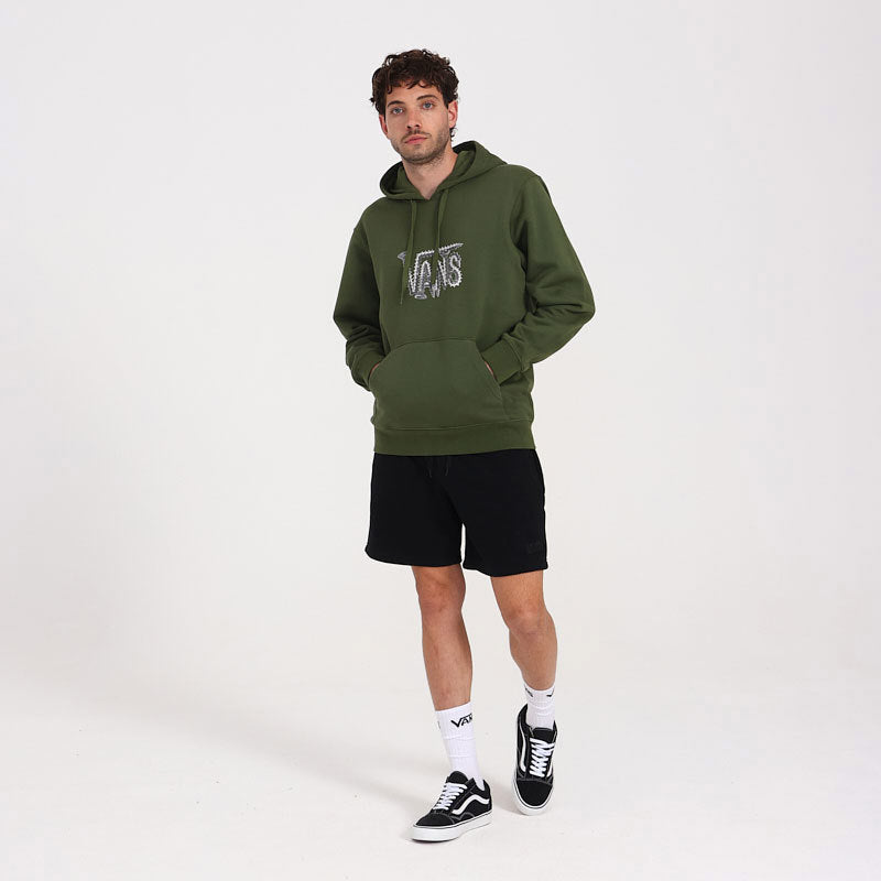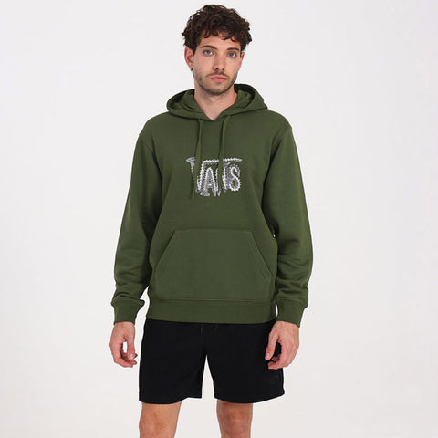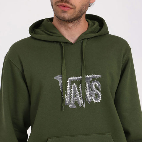 El buzo con capucha Wood Screws Pullover color verde ofrece un estilo urbano con calce holgado y detalles clásicos. Confeccionado en tejido polar cepillado de 70% algodón y 30% poliéster, proporciona calidez y confort en el uso diario. Incorpora capucha de dos piezas con cordón ajustable, bolsillo tipo canguro, puños y dobladillo acanalados, y un logotipo Vans® serigrafiado en el pecho.