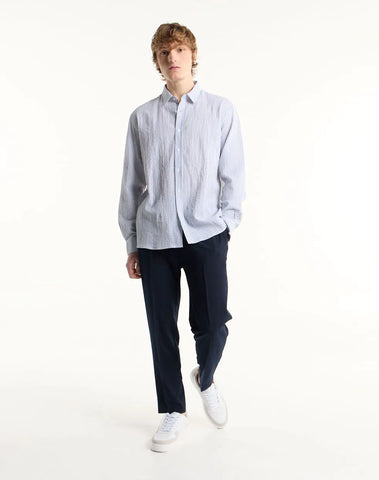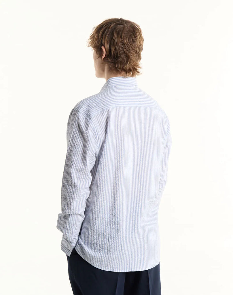 Camisa de Algodón efecto Seersucker a rayas y cuello ingles. Moldería Classic fit