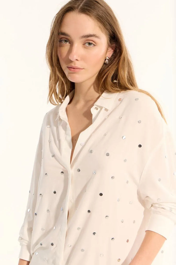 Camisa de calce recto con cuello a la base y manga larga. Detalle de tachas metálicas en toda la prenda. Tejido creppe de viscosa.