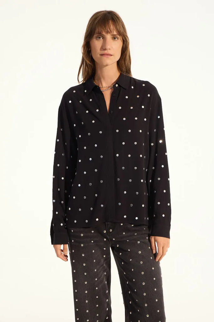 Camisa de calce recto con cuello a la base y manga larga. Detalle de tachas metálicas en toda la prenda. Tejido creppe de viscosa.