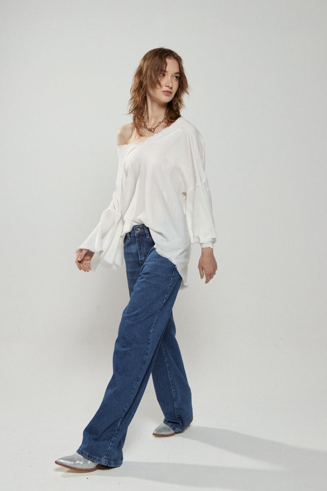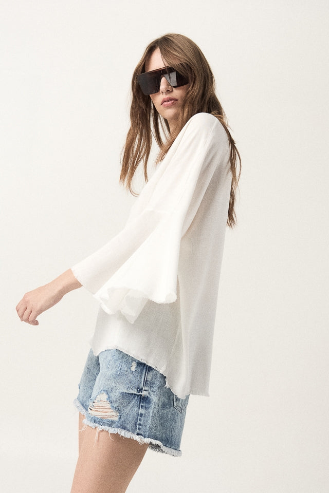 Blusa amplia escote en V con cuellos, mangas y ruedo desflecado.Composición: 100 % rayon.Cuidados: Prenda delicada.