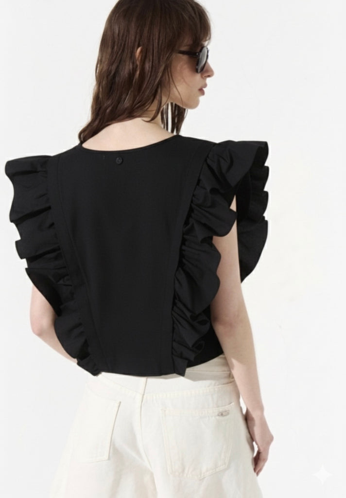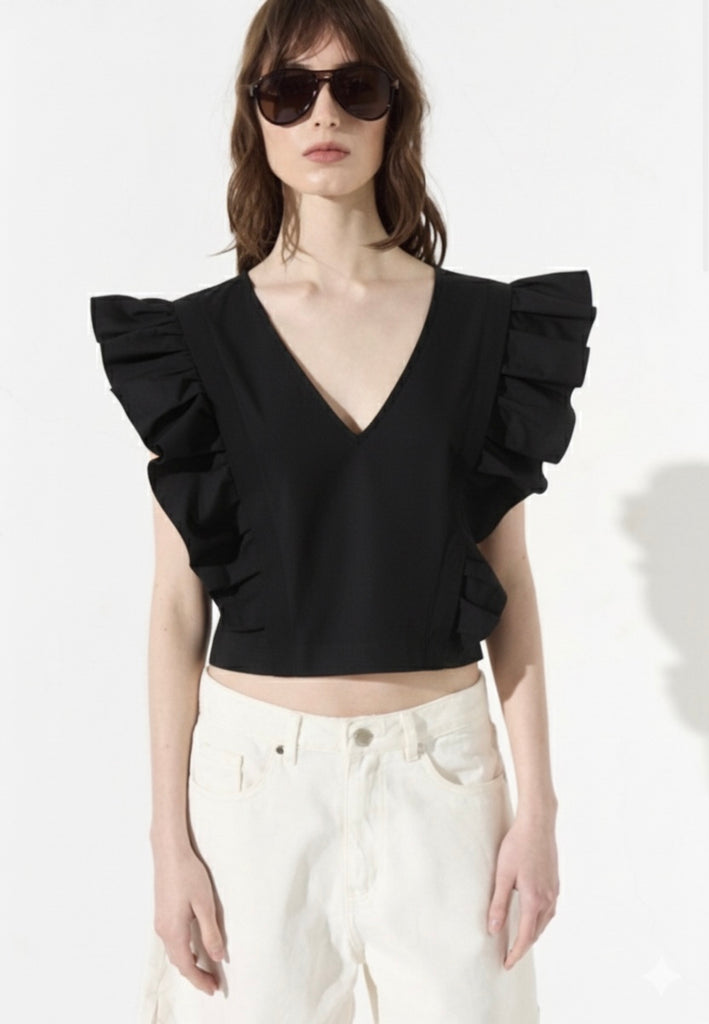 Blusa confeccionada en poplin de algodón, con escote V y amplios volados.Tiene acceso en lateral con cierre invisibles y chapita metálica con identificación de marca.