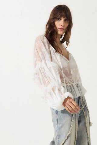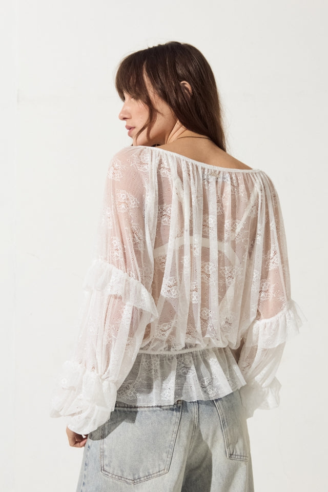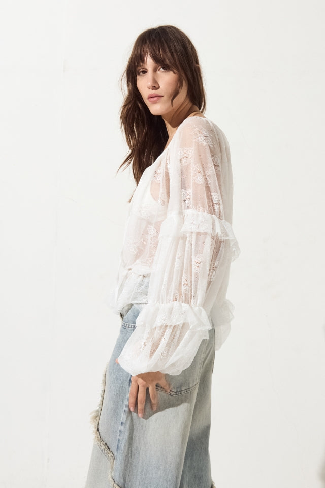 Blusa de encaje, cuello redondo con lazo en escote y detalle de volados en mangasComposición: 90% nylon 10% spandex