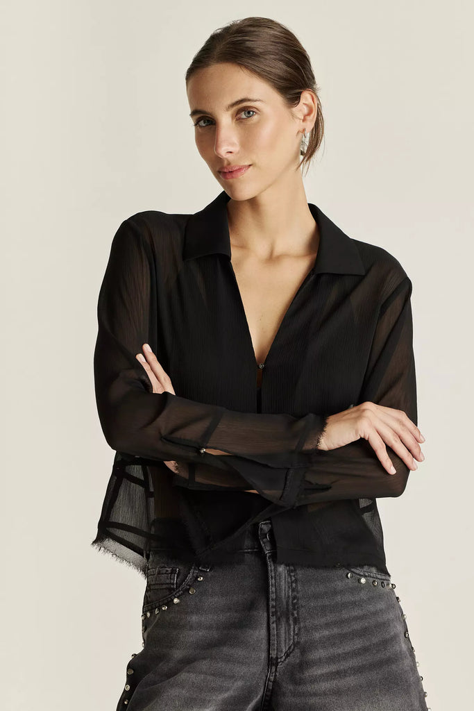 Confeccionada en gasa traslucida, la blusa amy tiene mucha personalidad. Lleva botones personalizados Tucci. Un must have para tu vestidor.