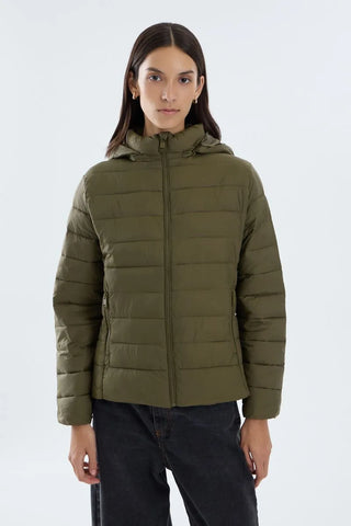 Campera ultra light de largo a primer cadera. Con cuello alto y capucha desmontable. Matelaseado de bastones oblicuos. Bolsillos externos e internos. Forreria a tono. Es una prenda ultra liviana, trae una riñonera de guardado. En compromiso con la sostenibilidad.
