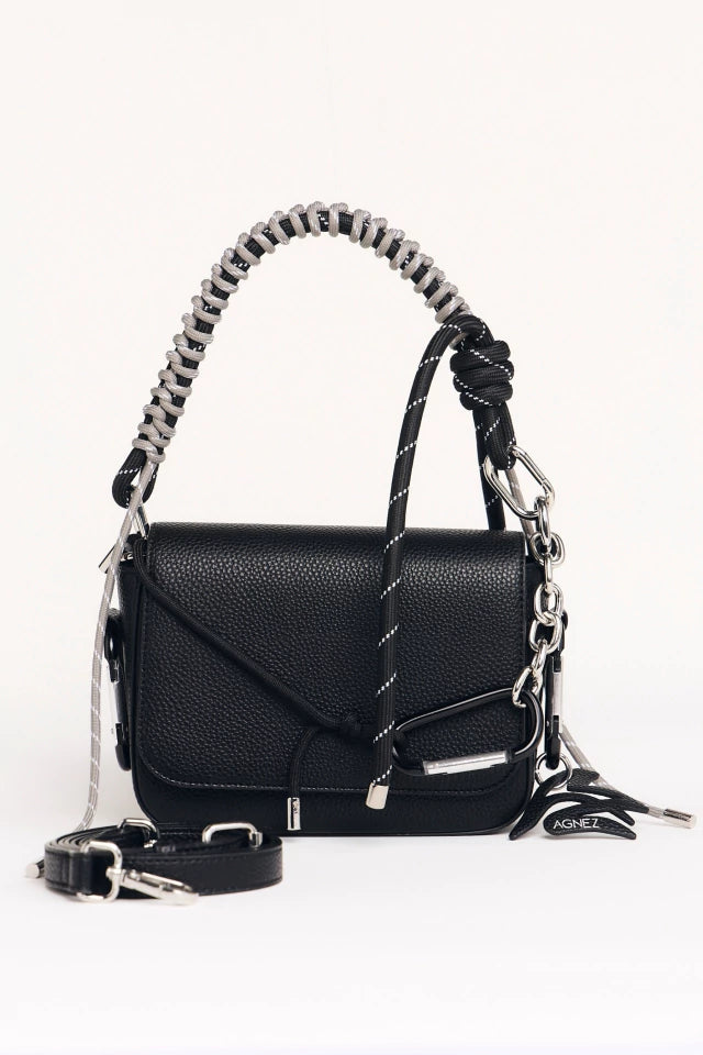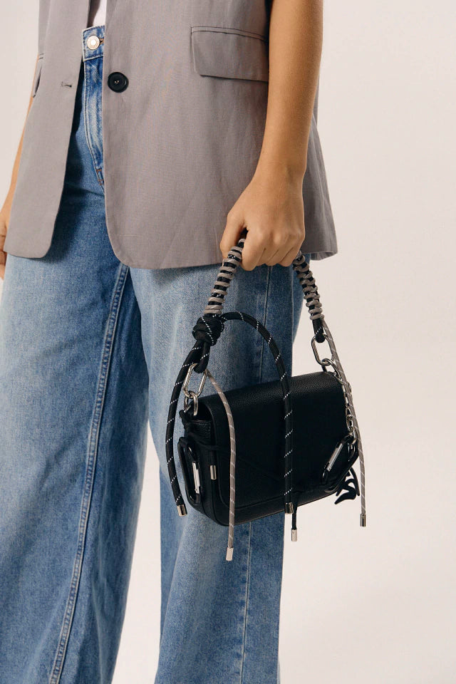 El modelo Box destaca por su diseño rígido y su manija hecha con sogas de doble color. Con tres mosquetones, dos en los laterales y uno frontal generando un contraste entre un estilo chic y urbano. La tapa es con broche iman.
