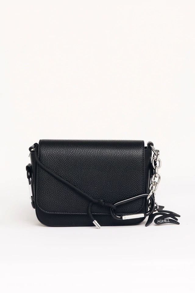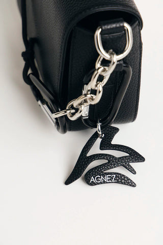 El bolso tiene un pequeño bolsillo interno y el exterior en la espalda, está decorado con el logo grabado. El material general es de ecocuero, e incluye una correa extraíble y un llavero de la marca.