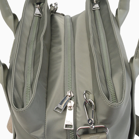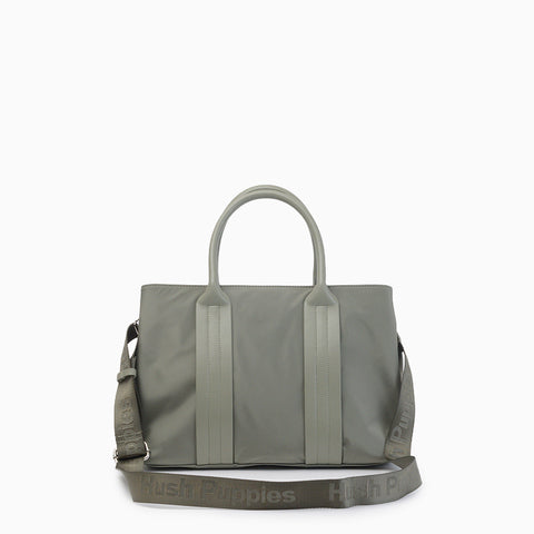 La Cartera Hush Puppies Albania color verde está confeccionada en una combinación de textil sintético y cuero ecológico que realza su estilo moderno y versátil. Incorpora dos asas cortas fijas para llevar al hombro y una correa larga regulable en cinta jacquard personalizada que permite usarla como bandolera. Su diseño estructurado con múltiples compartimientos y tres accesos con cierre, incluido un compartimiento central de gran apertura, asegura practicidad y organización. Presenta además avíos metálicos de la marca y forrería personalizada. Sus dimensiones son 24 cm de ancho, 38 cm de alto y 12 cm de profundidad.