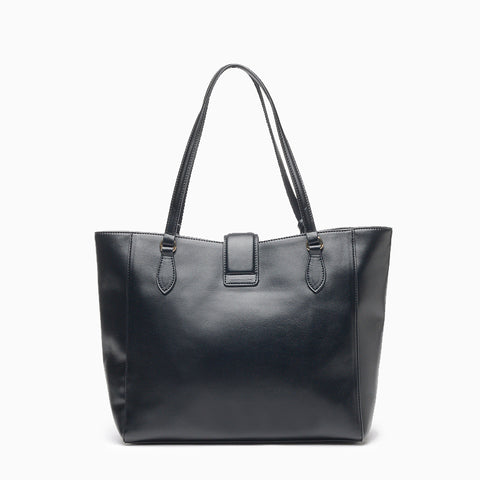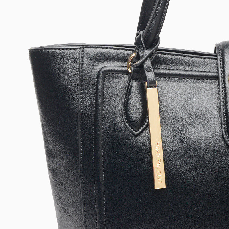 La Cartera Hush Puppies Bosa color negro está confeccionada en cuero ecológico con acabado liso y diseño estructurado, ideal para el uso diario o de oficina. Presenta doble asa larga fija para llevar al hombro y solapa frontal con broche magnético decorado con aplique metálico en tono dorado. Incluye un colgante metálico grabado como accesorio ornamental. Su acceso principal es mediante cierre metálico que garantiza seguridad y practicidad. Sus dimensiones son 44 cm de ancho, 28 cm de alto y 9 cm de profundidad.