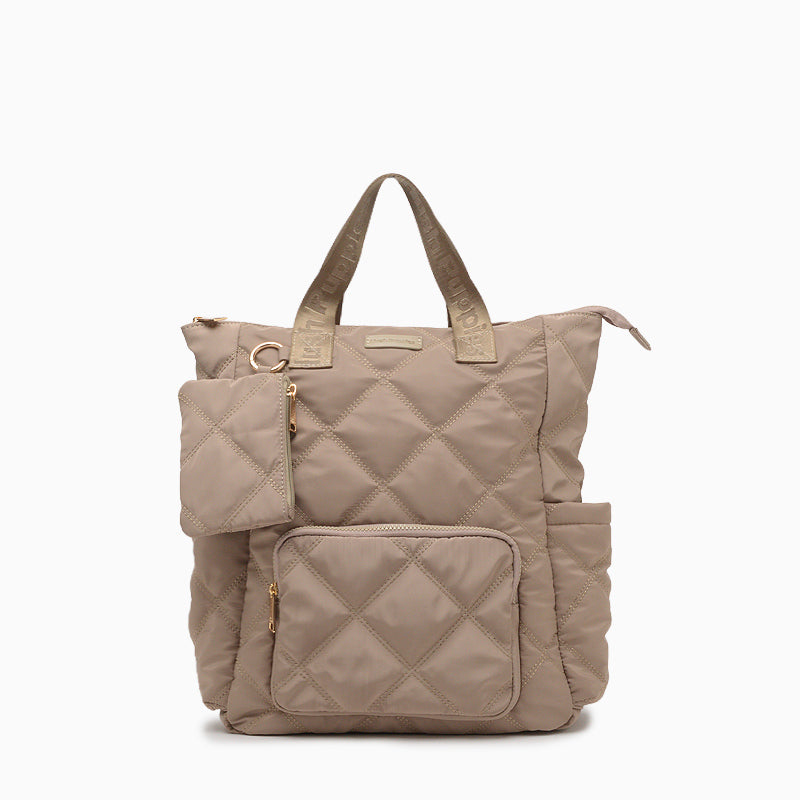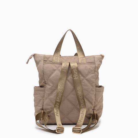 La Mochila Hush Puppies Breda color beige está confeccionada en textil sintético matelaseado que aporta un toque elegante y distintivo al uso diario. Presenta tiracierres metálicos dorados y acceso principal con cierre a tono, además de un bolsillo delantero con cierre y compartimientos laterales que amplían el espacio de guardado. Sus correas regulables en cinta jacquard personalizada aseguran comodidad, mientras que el interior con forrería personalizada y bolsillo con cierre brinda practicidad y organización. Sus dimensiones son 39 cm de alto, 37 cm de ancho y 9 cm de profundidad.