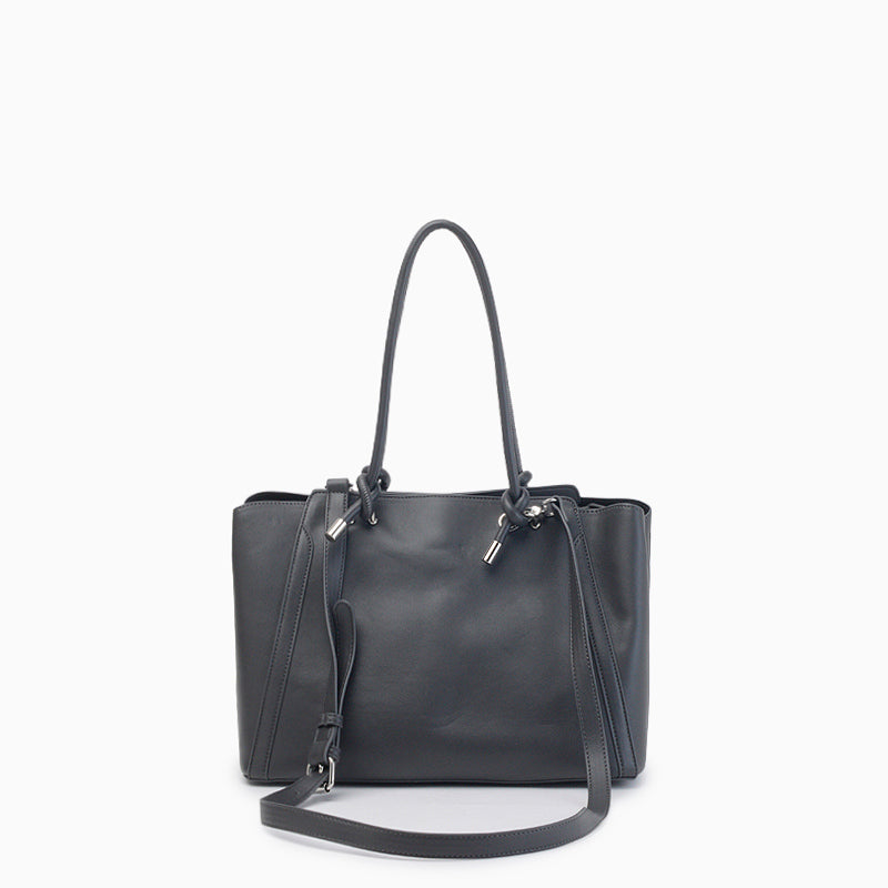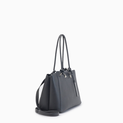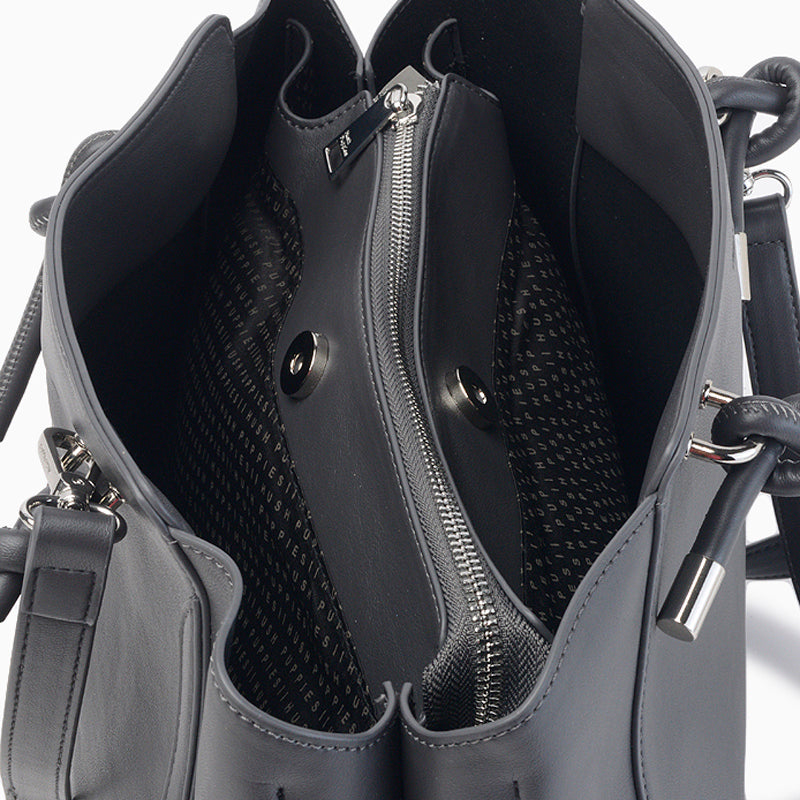 La Cartera Hush Puppies Olbia color negro está confeccionada en cuero ecológico de tacto suave con un diseño semirrígido que combina estilo y funcionalidad. Presenta doble asa corta con detalle de nudos en los extremos y una correa ajustable y removible para llevar cruzada. Incorpora tres compartimientos: dos con botones metálicos imantados y un compartimiento central con cierre, lo que asegura practicidad y organización. Su base firme y costuras reforzadas aportan estabilidad, mientras que los tiradores metálicos marcarios y el colgante grabado suman un detalle moderno. El interior incluye forrería personalizada y un bolsillo con cierre. Sus dimensiones son 32 cm de ancho, 24 cm de alto y 17 cm de profundidad.
