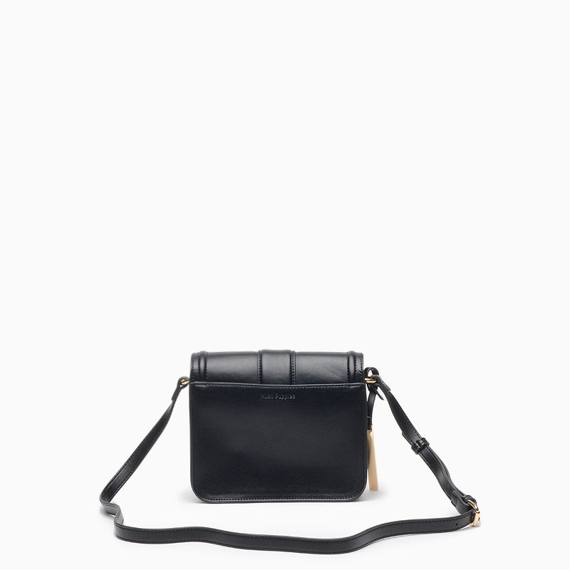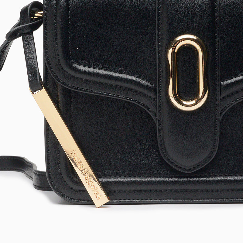 La Cartera Hush Puppies Siena color negro está confeccionada en cuero ecológico de acabado liso con un diseño estructurado y elegante. Presenta solapa con cierre magnético oculto y detalle decorativo metálico en tono dorado al frente, además de un colgante metálico grabado que realza su estilo. Incluye correa larga ajustable para llevar al hombro o cruzada, y un acceso principal con cierre metálico. En el interior incorpora forrería personalizada de la marca y un bolsillo con cierre que aporta practicidad. Sus dimensiones son 20 cm de ancho, 16 cm de alto y 7 cm de profundidad.