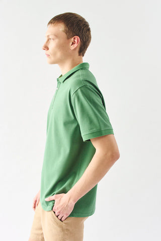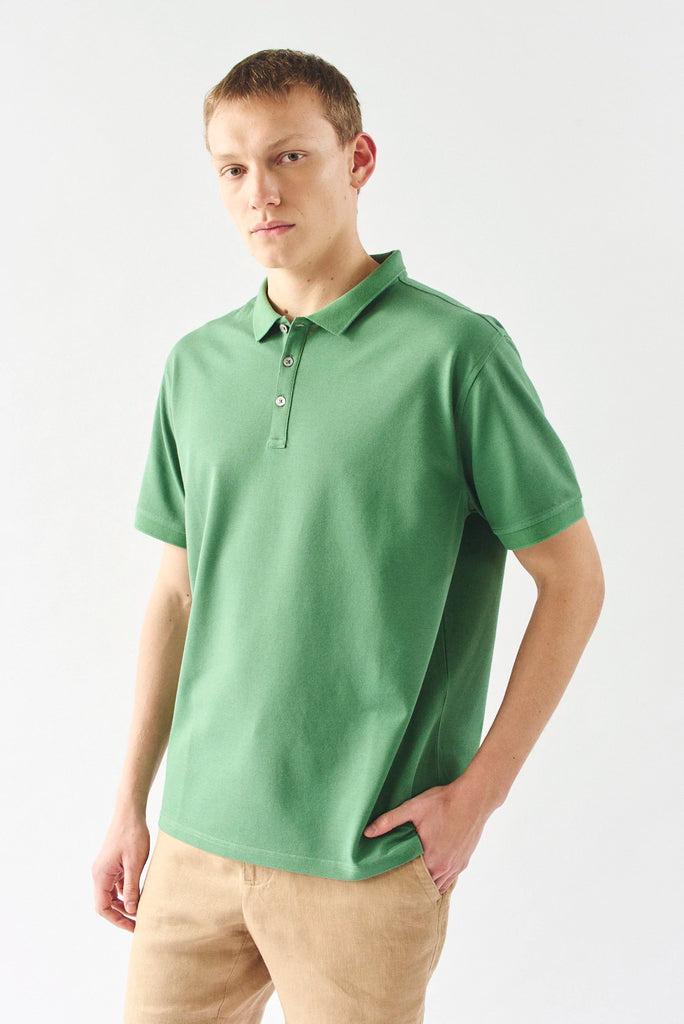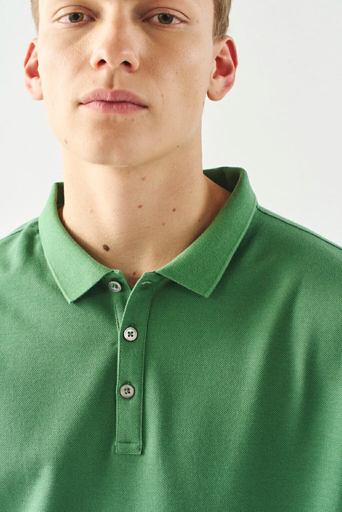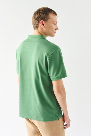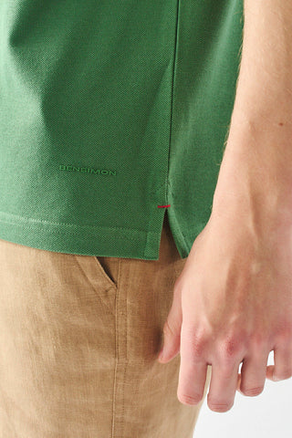 Chomba manga corta con tajos laterales, cuello y puños tejidos. Calce regular. Tejido liquid cotton pique.