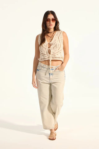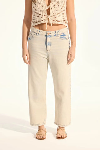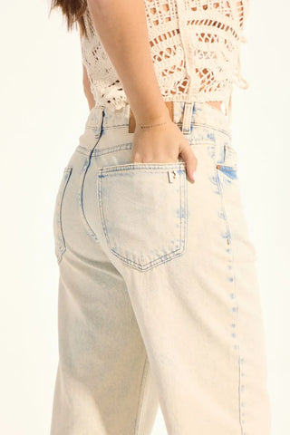 Jean de calce recto, con la pierna levemente holgada. Tiro medio, su lavado es matizado con un leve dejo de color rosa en el fondo. Ruedo terminado al corte. Su género es rígido 100% algodón.