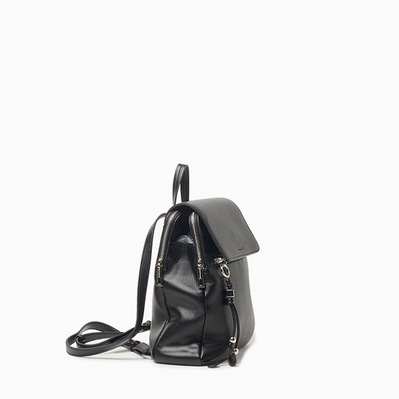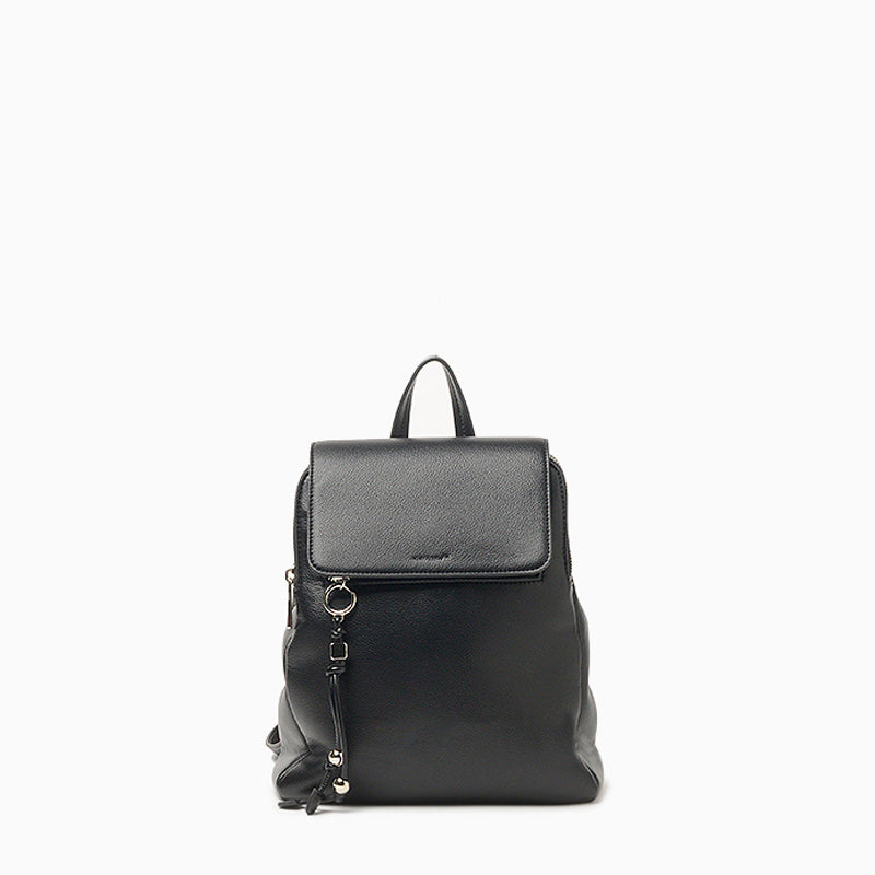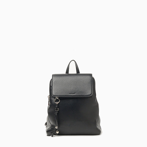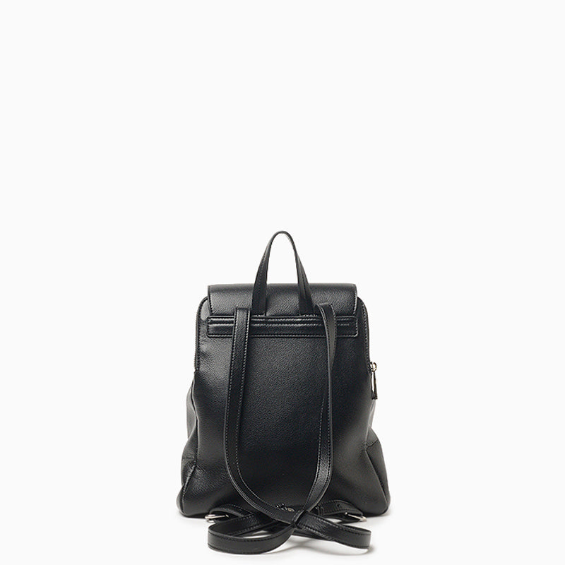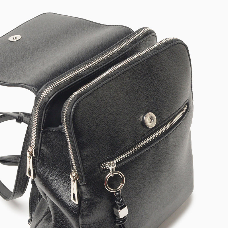 La mochila Hush Puppies Karl color negro está confeccionada en cuero ecológico blando con acabado graneado. Presenta formato cuadrado, tapa con cierre de botón imán, dos compartimientos con cierre, bolsillo central con espacio interno adicional, bolsillo delantero con llavero y correas regulables con herrajes metálicos. Sus medidas son 33 cm de alto, 25 cm de ancho y 8,5 cm de profundidad.