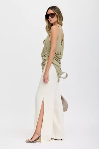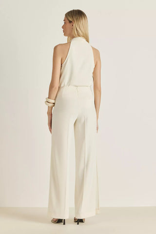 Este pantalón de corte sastrero se destaca por su calce fluido y detalle en satén que aporta un toque sofisticado. Su caída suave acompaña el movimiento, ideal para un look cómodo y refinado.