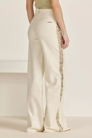 Pantalón de denim tiro bajo fit wide leg color crudo. Detalle de combinación de guipiure en laterales. Boton, remaches y chapita pulidos espejo exclusivos de la marca. Combinalo con la Campera Lace Ecru.