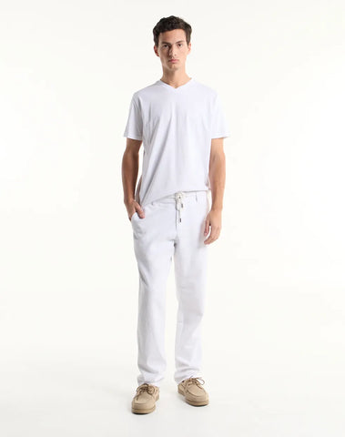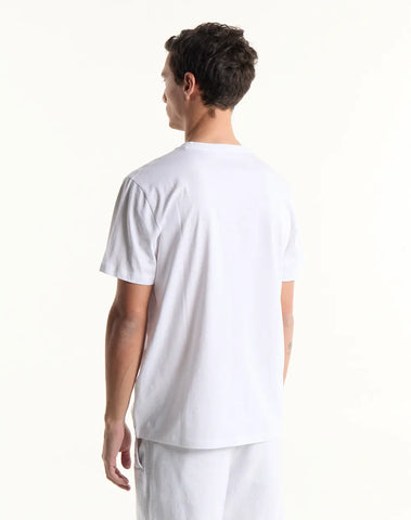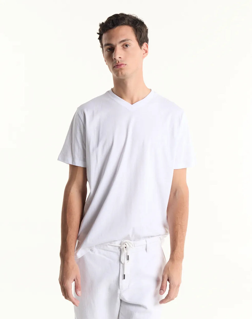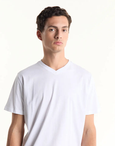 Remera de jersey manga corta con escote en V. Levemente entallada en la cintura.