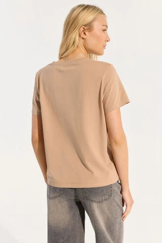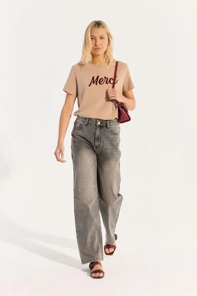 Remera de calce regular con manga corta. Detalle de estasmpa en flock roto en delantero y lavada. Tejido de algodon