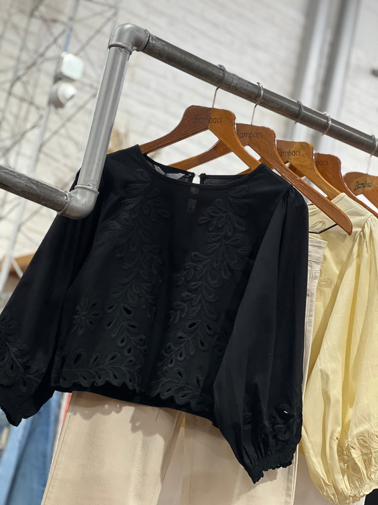 Blusa con detalles en broderie y mangas 3/4 estilo balloon.Chapita metálica con identificación de marca en centro espalda.