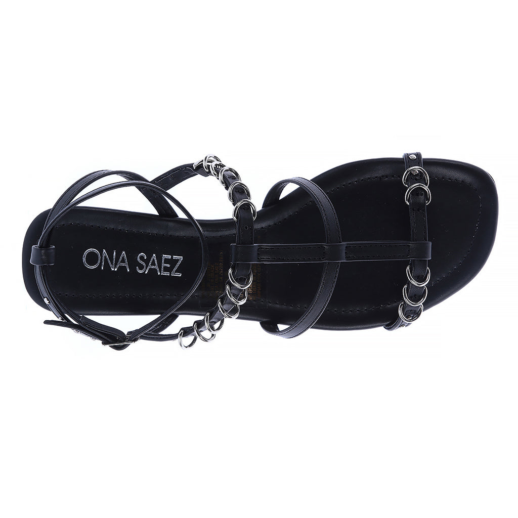 Sandalia flat confeccionada en PU (símil cuero) con diseño de tiras finas estilo T-Strap adornadas con argollitas metálicas y apliques color plata que le aportan un look sofisticado y distintivo.