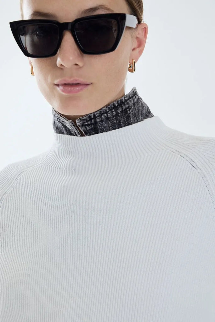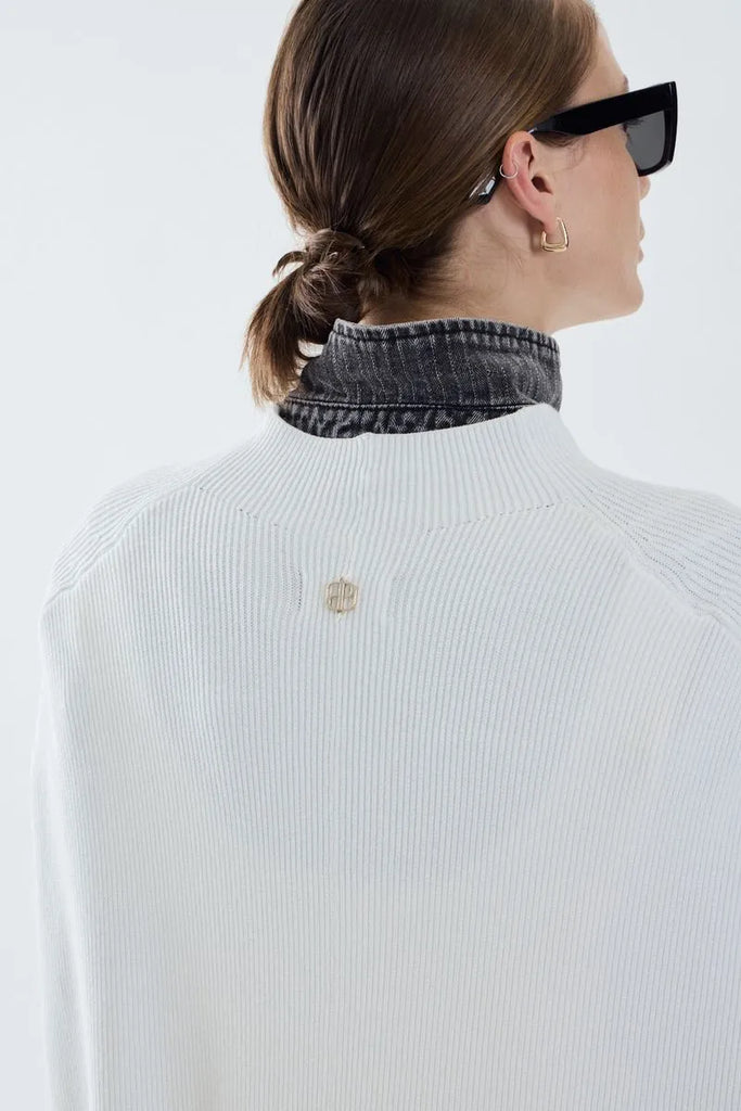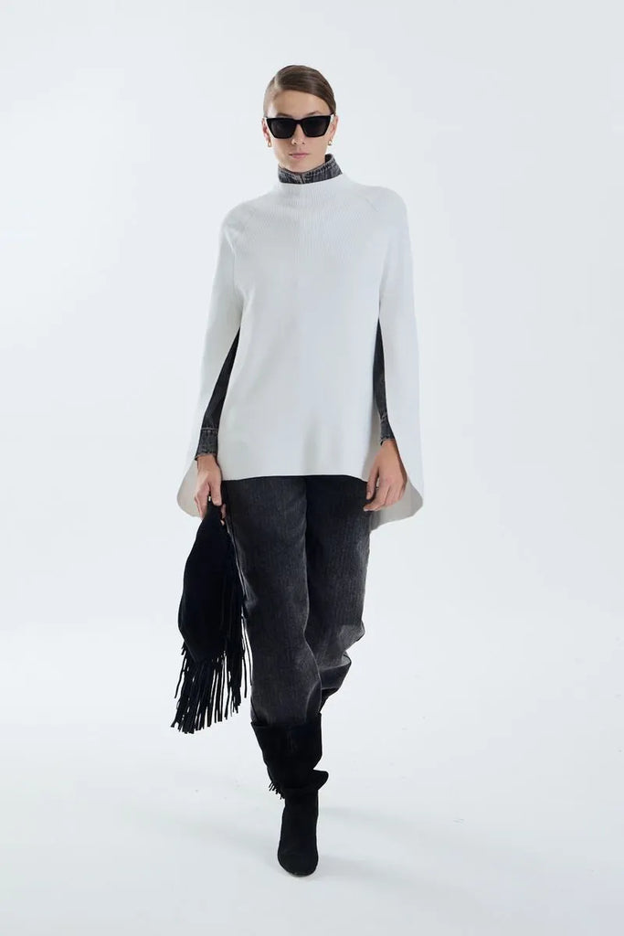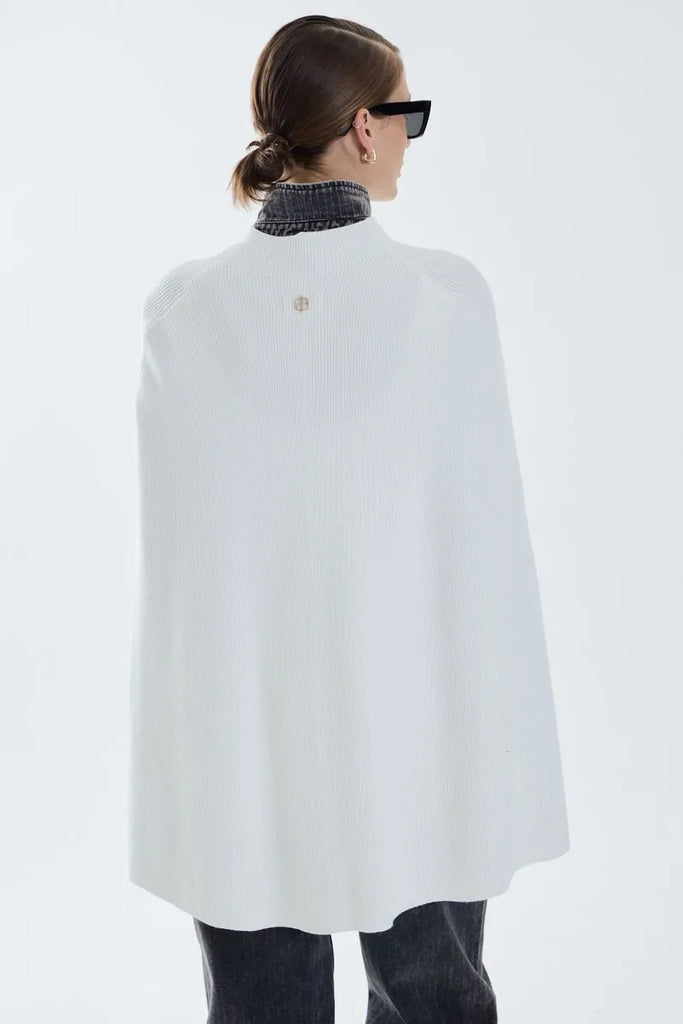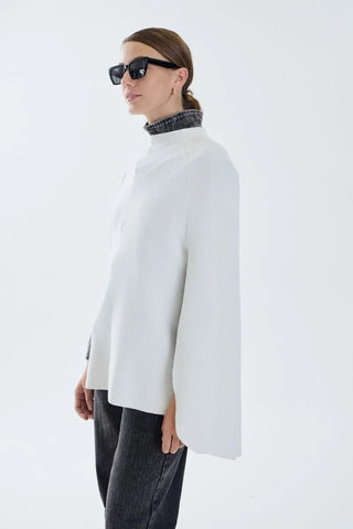 Capa tejida de calce amplio. Sweater tejido con cuello alto y calce entallado en el cuerpo, pero sobre la espalda cae una capa. Es un diseño moderno y versátil, ideal para un look elegantes y moderno.