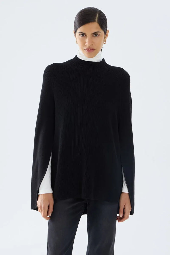 Capa tejida de calce amplio. Sweater tejido con cuello alto y calce entallado en el cuerpo, pero sobre la espalda cae una capa. Es un diseño moderno y versátil, ideal para un look elegantes y moderno.