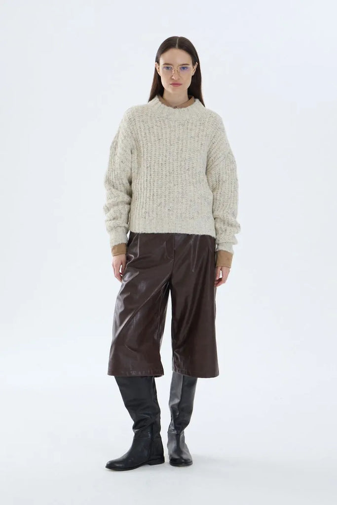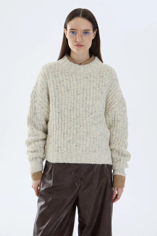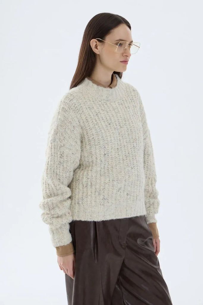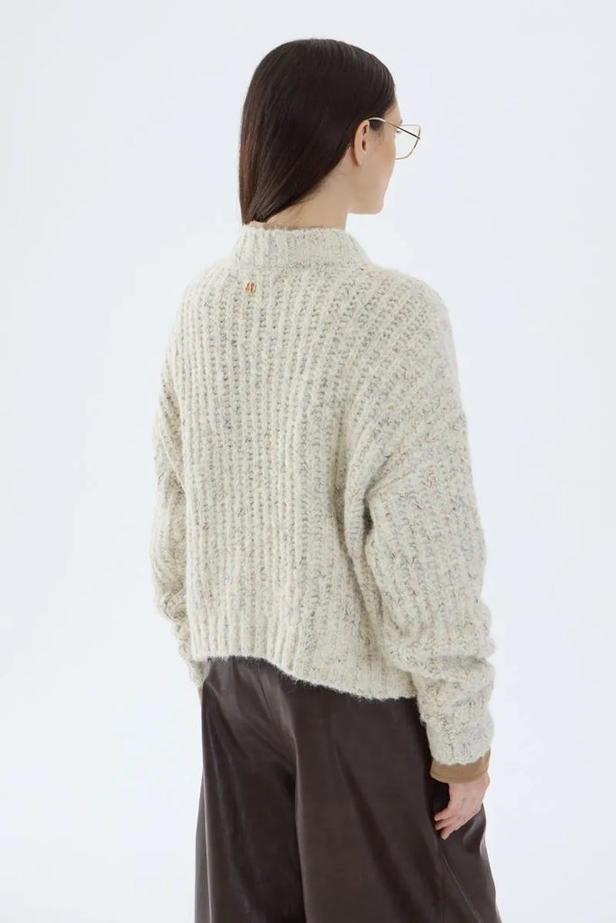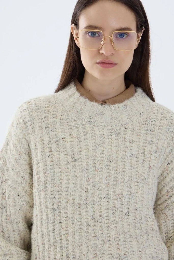 Polera de calce clásico con largo modular a la primera cadera y cuello redondo a la base. Su diseño combina un hilado jaspeado y una composición de material reciclado con un pequeño porcentaje de lana, que lo hace abrigado y sostenible con el medio ambiente.