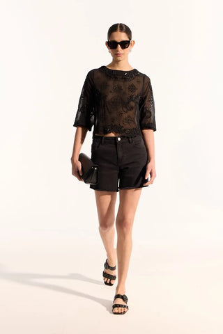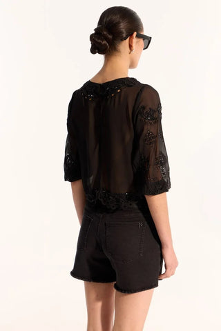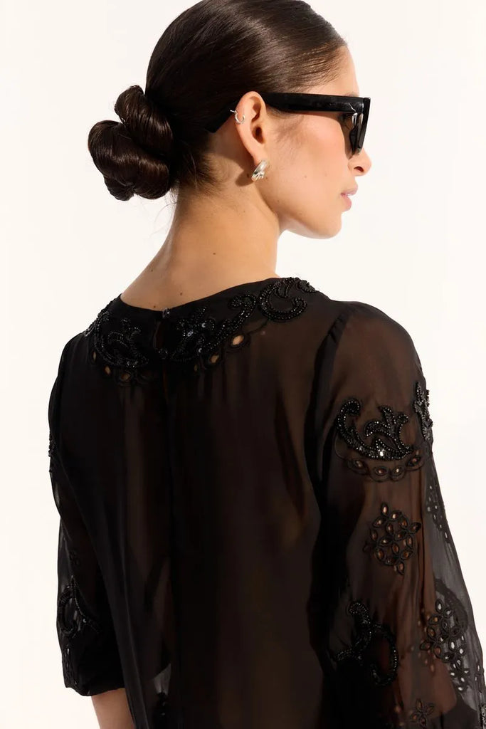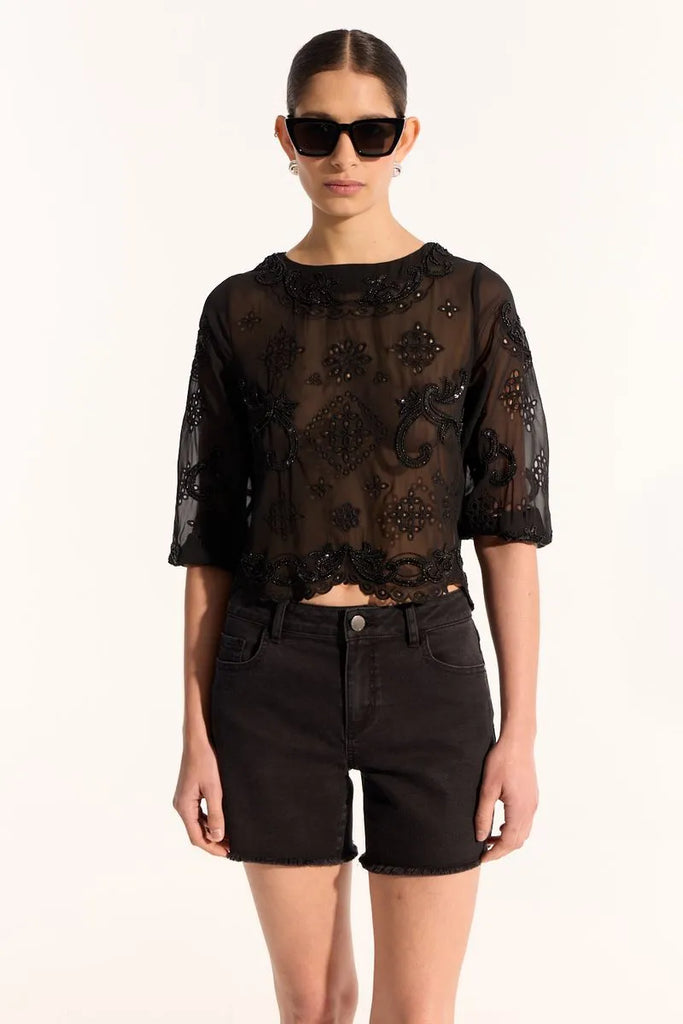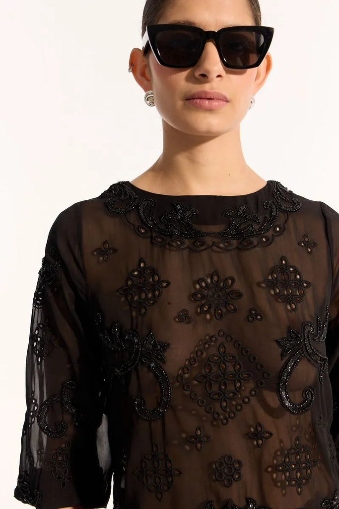 Top bordado de calce regular, bordado en canutillos e hilos al tono, en tejido gasa 100 % poliéster, ideal para ocasiones especiales.
