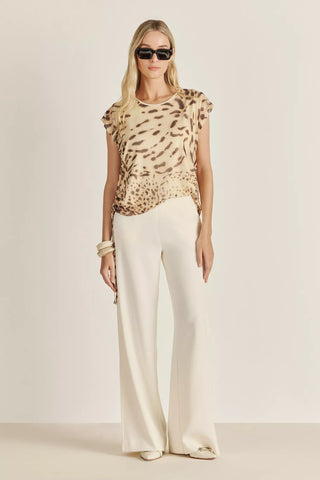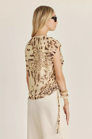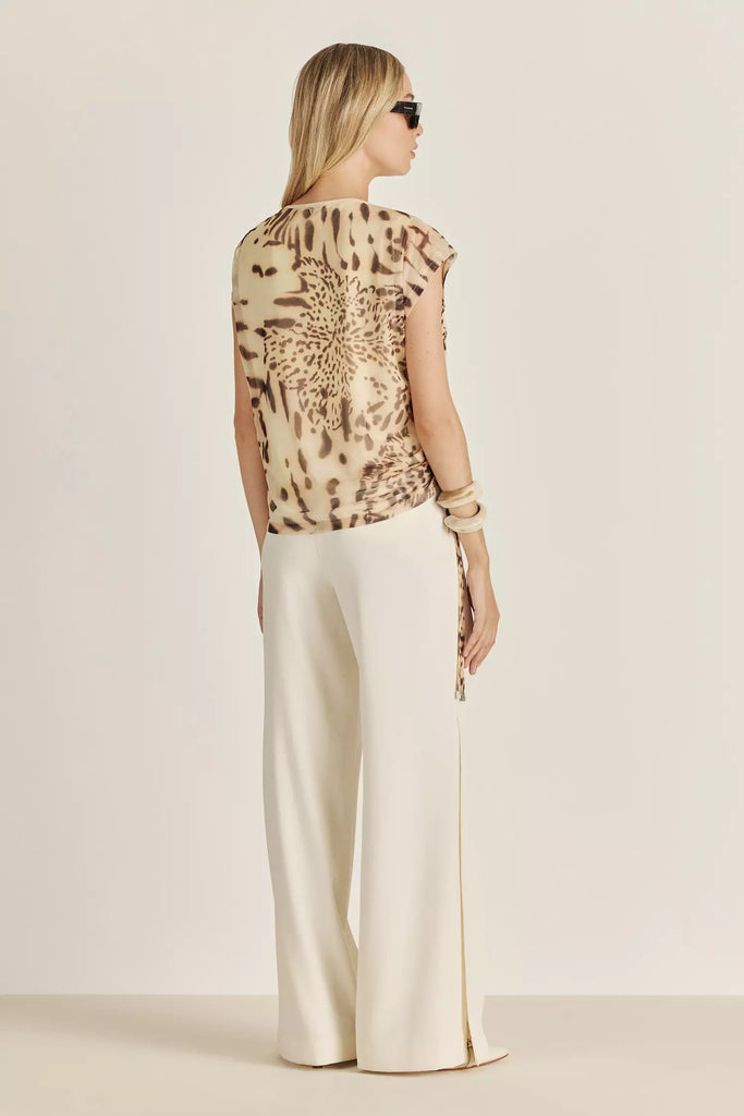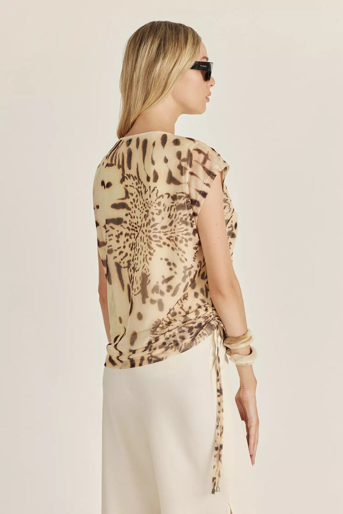 Top confeccionado en género de punto con transparencia y diseño de estampa exclusiva de la colección Verano 26, en combinación con género de punto por debajo. En los laterales lleva frunces ajustables a gusto.