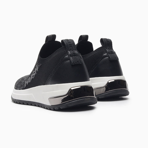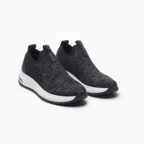 Zapatilla Hush Puppies Cien color negro slip on confeccionada en tejido, con pieza de talón reforzada en material sintético que aporta mayor durabilidad. Incorpora cinta bicolor en el empeine con detalle a rayas y identificación HUSH en el perfil en alta frecuencia, junto a aplique de cinta en el talón con identificación de la marca. La plantilla con tecnología Ortholite ofrece una pisada confortable y respirable, manteniendo un buen nivel de frescura durante todo el día. Presenta fondo de goma antideslizante con suelín del mismo material y aplique de estabilizador metálico en el talón, que mejora la estabilidad y el control al caminar. Altura total de la suela: 3,4 cm.