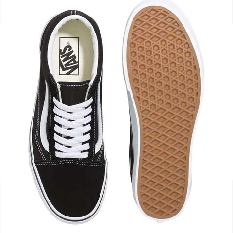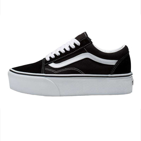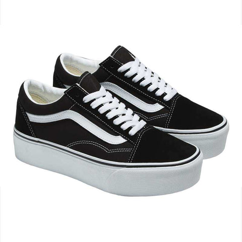 Zapatilla VANS original Old Skool Stackform color negro/blanco, una reinterpretación del modelo clásico con plataforma que suma presencia sin perder identidad urbana. Su capellada textil tejida con patrón Checkerboard aporta resistencia y textura, mientras que el cuello acolchado mejora el ajuste y el confort en el uso diario. La suela waffle de goma antideslizante ofrece tracción firme y durabilidad. La plataforma elevada de 3,5 cm completa esta silueta de corte bajo con un perfil sólido y estable.